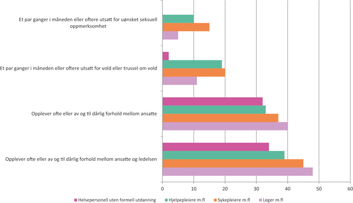 Om lag 18 prosent av kvinnelige helsearbeidere svarte at de har blitt utsatt for vold eller trussel om vold et par ganger i måneden eller oftere (Rønning 2010). Tilsvarende tall for andre sysselsatte kvinner var 4 prosent. Gruppen sykepleiere med flere og hjelpepleiere med flere er de som i størst grad er utsatt for vold og trakassering. Kvinnelige helsearbeidere opplevere også i større grad enn andre kvinner å bli utsatt for uønsket seksuell oppmerksomhet på jobben. En av ti helsearbeidere mot en av 20 kvinner ellers opplevde uønsket seksuell oppmerksomhet et par ganger i måneden eller oftere i 2006. Sykepleiere og hjelpepleiere er de yrkesgruppene som er mest utsatt.