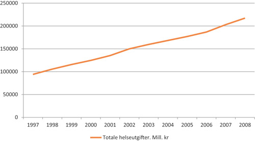 Det har vært en kraftig vekst både i utgifter og årsverk i helse- og omsorgssektoren de siste årene og utvikling i demografi og teknologi taler for at etterspørselen etter tjenester bare vil øke i de neste tiårene. Figur 4.4 viser at det fra 1997 til 2008 har vært en økning i totale helseutgifter på 123 mrd. norske kroner.