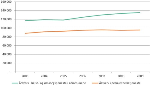 Figur 4.5 viser utviklingen i årsverk i helse- og omsorgssektoren fra 2003 til 2009. Det finnes ikke sammenlignbar offisiell statistikk for årsverk i tjenesten som helhet lenger tilbake enn 2003.6 Antall utførte årsverk i helse- og omsorgstjenesten har steget jevnt, og i 2009 ble det utført i alt 230 866 årsverk hvorav 135 434 i den kommunale helse- og omsorgssektoren og 95 432 i spesialisthelsetjenesten. Den totale økningen i antall årsverk siden 2003 er større i den kommunale helse- og omsorgssektoren enn i spesialisthelsetjenesten målt i absolutte og relative tall.