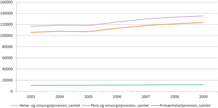 Figur 4.7 nedenfor viser at det ble uført om lag 135 000 årsverk innenfor den kommunale helse- og omsorgssektoren i 2009, om lag 123 000 innenfor pleie- og omsorgstjenesten og om lag 12 000 innenfor primærhelsetjenesten.