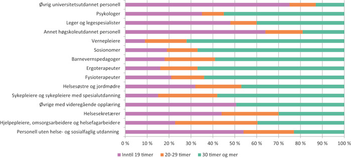 Det er stor variasjon i avtalt arbeidstid for helse- og sosialpersonell. Offisiell statistikk viser at gjennomsnittelig avtalt arbeidstid har gått ned fra 30,7 timer i 2005 til 30,1 timer i 2009. Hjelpepleiere hadde i gjennomsnitt 26,9 timer per uke, sykepleiere 30,2 timer per uke og leger 37,7 timer per uke.