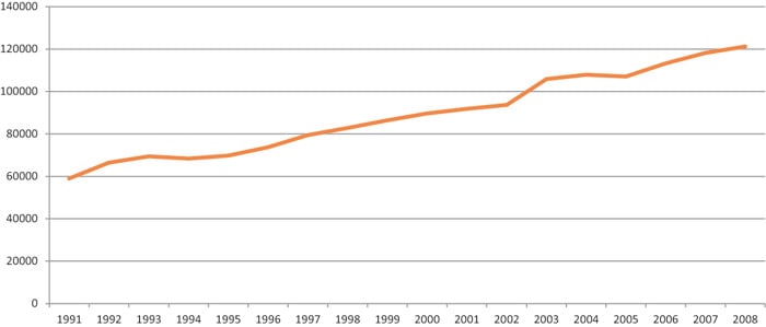 Figur 4.11 viser at det har vært en økning i årsverksutviklingen i spesialisthelsetjenesten i perioden 1990 – 2007 med en liten nedgang fra 2007 til 2008. I de siste årene har veksten vært høyere spesielt fra 2002 til 2003.