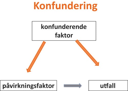 En konfunderende faktor er en variabel som er assosiert både med påvirkningsfaktoren og utfallet i en studie. Det er ikke en mellomliggende variabel som formidler effekt (en mekanisme), men en variabel som skaper en tilsynelatende sammenheng eller som skjuler en sann sammenheng mellom påvirkningen og utfallet.1 Figur 7.1 ovenfor viser dette skjematisk.