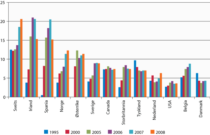 Figur 11.1 Bruttoinnvandring per 1 000 innbyggere i utvalgte OECD-land. Bruttoinnvandring i 1995, 2000, 2005, 2006, 2007 og 2008.
