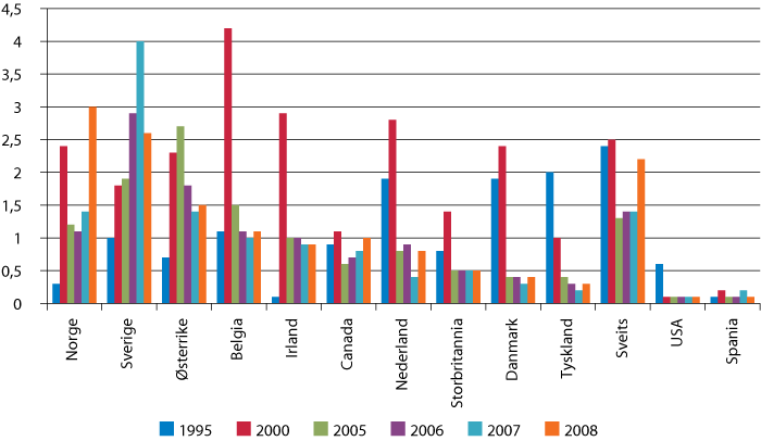 Figur 11.3 Antall asylsøkere per 1 000 innbyggere i utvalgte OECD land. Asylsøkere i 1995, 2000, 2005, 2006, 2007 og 2008.