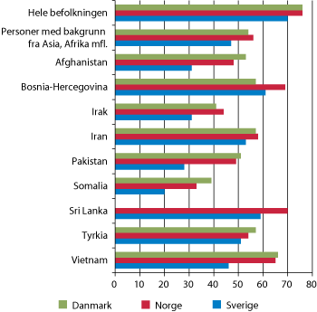 Fjerde kvartal 2009 var sysselsettingsnivået for hele befolkningen på 76 pst. både i Danmark og Norge, noe som var 6 prosentpoeng høyere enn i Sverige. Forskjellen på sysselsettingsnivået for personer fra land i Asia, Afrika mfl. og hele befolkningen var på samme tid på 23 prosentpoeng i Sverige, 22 i Danmark og 20 i Norge. Jevnt over er sysselsettingsnivået for de enkelte innvandrergruppene lavt i Sverige, f.eks. Somalia, Afghanistan, Irak og Pakistan, sammenliknet med i Norge. I Danmark er det noe høyere sysselsetting blant dem med bakgrunn fra Afghanistan og Somalia enn i Norge. Personer med bakgrunn fra Bosnia-Hercegovina har høyere sysselsettingsnivå i Norge enn i de to andre landene. I hovedsak kan det se ut til at landbakgrunn er viktigere enn hvilket land innvandrerne er bosatt i.