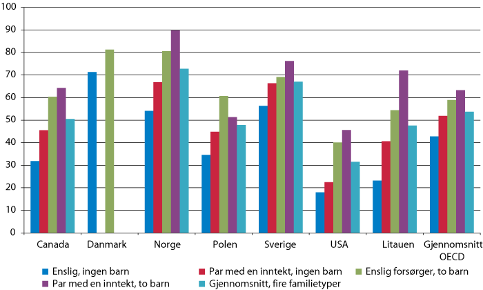 Figur 11.6 viser gjennomsnittlig netto kompensasjonsgrad etter skatt ved arbeidsledighet over en periode på fem år for fire ulike familietyper for de landene som er beskrevet nærmere i avsnittene 11.4–11.8, med unntak av Nederland, som OECD ikke har publisert slike tall for. I tillegg viser figuren Polen og Litauen, siden dette er viktige innvandringsland for Norge, jf. kapittel 7. Figuren tar utgangspunkt i samlede offentlige overføringer, herunder arbeidsledighetstrygd i den perioden dette utbetales. Det framgår tydelig av figuren at den samlede kompensasjonsgraden er høy i de nordiske landene sammenliknet med de fleste andre land, og aller høyest i Norge. Mens kompensasjonsgraden for enslige uten barn er merkbart høyere i Danmark enn i Norge og kompensasjonsgraden for en enslig forsørger med to barn er marginalt høyere i Danmark enn i Norge, er den gjennomsnittlige kompensasjonsgraden for de resterende typeeksemplene høyere i Norge enn i de øvrige landene som stilles opp i figuren, og betydelig høyere enn gjennomsnittet for OECD. Det framgår f.eks. av figuren at en norsk eninntektsfamilie med to barn i gjennomsnitt vil ha en inntekt etter skatt svarende til om lag 90 pst. av tidligere inntekt over en arbeidsledighetsperiode på fem år. Dette er merkbart høyere enn gjennomsnittet for OECD og om lag dobbelt så høyt som for USA.