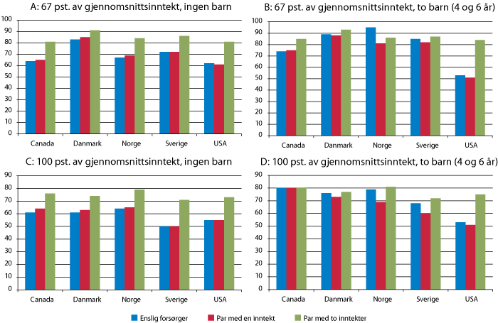 Figur 11.7 viser gjennomsnittlig netto kompensasjonsgrad idet arbeidsledigheten inntrer for to ulike inntektsnivåer og familietyper. For personer med lønnsinntekt under gjennomsnittet og uten barn ligger kompensasjonsgraden merkbart høyere for de nordiske landene enn for Canada og USA, særlig når det gjelder eninntektsfamilier. Par med to inntekter har gjennomgående den høyeste kompensasjonsgraden. Dette har antakelig sammenheng med at det også i en situasjon der én i paret er arbeidsledig, legges til grunn at den andre personen er i arbeid og har en lønnsinntekt tilsvarende 67 pst. av gjennomsnittsinntekten i landet. For personer med to barn er kompensasjonsgradene jevnt over noe høyere, med unntak av for USA. Dette har sammenheng med at det i mange tilfeller ytes tilleggsytelser for forsørging av barn. For Norge ser man at kompensasjonsgraden for en enslig forsørger med to barn ligger på om lag 95 pst. av tidligere inntekt ved påbegynt arbeidsledighet. Dette har bl.a. sammenheng med at det kan ytes overgangsstønad for enslige forsørgere som ikke står i arbeid. Denne stønaden kan utgjøre inntil om lag kr 150 000 per år.