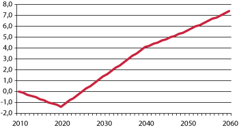 MSG-beregningene tar, som generasjonsregnskapet, utgangspunkt i en videreføring av dagens velferdsordninger. Disse beregningene gir en tidsbane for utviklingen, og kan således antyde når eventuelle problemer oppstår. Inndekningsbehovet for offentlige finanser måles ved den endringen i skatte- og avgiftsnivået som er nødvendig for å møte den anslåtte utgiftsutviklingen innenfor den rammen for bruk av oljeinntekter som handlingsregelen setter. Målt i forhold til anslåtte skatter og avgifter som andel av BNP for Fastlands-Norge i 2010, tilsvarer det anslåtte inndekningsbehovet i 2060 om lag 7¼ pst. av BNP for Fastlands-Norge, jf. figur 12.1. Framskrivingene indikerer at det innenfor de rammene handlingsregelen setter for bruk av oljeinntekter isolert sett vil være rom for å senke skattenivået eller bedre velferdsordningene fram mot 2020 tilsvarende i størrelsesorden 1¼ pst. av verdiskapingen i fastlandsøkonomien. Fra 2020 vil imidlertid statens utgifter vokse raskere enn inntektene. En videreføring av etablerte ordninger krever da at det enten gjennomføres tiltak som demper utgiftsveksten eller tiltak som øker inntektene. Dersom handlingsrommet fram mot 2020 utnyttes, må inntektene deretter økes (eller utgiftene reduseres) tilsvarende om lag 8¾ pst. av BNP for Fastlands-Norge videre fram mot 2060.