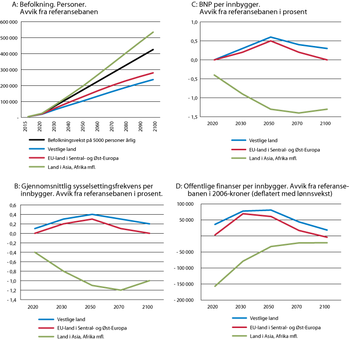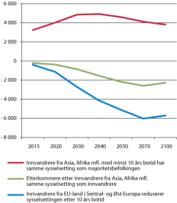 Demografiske endringer forplanter seg over i makroøkonomiske størrelser og offentlige finanser gjennom deltakelse på arbeidsmarkedet. Veksten i timeverkssysselsettingen gjennom perioden er om lag i samme størrelsesorden som veksten i befolkningen, men det er forskjeller avhengig av innvandrernes opprinnelsesland. En øking i innvandringen fra land i Asia, Afrika mfl. fører til at sysselsettingen i 2100 ligger nesten 5 pst. høyere enn i referansebanen, mens befolkningen har økt med nesten 6 pst. Det innebærer at sysselsettingsandelen faller og ligger i 2070 1,2 pst. lavere enn i referansebanen. Dette må ses i sammenheng med både lavere yrkesdeltakelse og noe større omfang av deltid. Beregningene viser også at når det kommer nye innvandrere hvert år går konvergensen i bl.a. sysselsettingsandeler vesentlig saktere sammenliknet med tilfellet der det kommer flere innvandrere i kun ett år. Økt innvandring fra både vestlige land og EU-land i Sentral- og Øst-Europa fører til at befolkningen i 2100 ligger om lag 3 pst. høyere enn i referansebanen. Sysselsettingen øker noe sterkere enn befolkningen i første del av framskrivingsperioden. Det innebærer at en viss øking i sysselsettingsfrekvensen, definert som antall årsverk dividert med befolkningen, sammenliknet med referansebanen.
