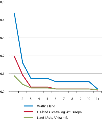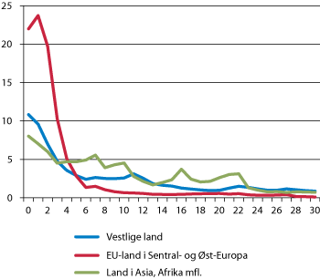 Det er en klar tendens til at økt innvandring også bidrar til høyere utvandring. Det må ses i sammenheng med at innvandrere i gjennomsnitt har høyere utvandringssannsynlighet enn befolkningen for øvrig, jf. kapittel 7. Utvandring, som både inkluderer tilbakeflytting til hjemlandet og videreflytting til andre land, er størst for innvandrere som kommer fra land som har fri adgang til Norge, som land i EØS-området. Sannsynligheten for at en innvandrer fra vestlige land skal ha utvandret igjen i løpet av to år etter innflyttingen er om lag 56 pst., jf. figur 12.2. Personer som kommer til Norge fra land utenfor Europa, dvs. hovedsakelig som flyktninger eller familiegjenforente med disse, har naturlig nok en vesentlig lavere utvandringssannsynlighet, om lag 9 pst. i løpet av de to første årene i Norge. For innvandrere fra vestlige land er konjunkturutviklingen særlig viktig for både inn- og utvandring. I 1988–1990, da Norge var inne i den dypeste nedgangskonjunkturen siden andre verdenskrig, var det netto utflytting fra Norge til vestlige land, jf. kapittel 7. Tilsvarende var nettoinnvandringen rekordhøy i 2008, som var toppåret i den seneste oppgangskonjunkturen. Etter en nedgang i 2009 økte nettoinnvandringen i 2010 nesten opp til nivået i 2008. For innvandrere fra EU-land i Sentral- og Øst-Europa er det lite relevant erfaringsmateriale for å anslå utvandringssannsynlighetene framover. Befolkningsframskrivingene bygger på at denne gruppen har en utvandringssannsynlighet de første årene etter innvandring som ligger på om lag halvparten av utvandringssannsynligheten for innvandrere til Norge fra vestlige land, slik at om lag 20 pst. er utvandret etter to år. Usikkerheten her er imidlertid stor, da vi vet lite om hvor lenge innvandrere fra særlig de nye EU-landene i Sentral- og Øst-Europa blir i Norge.