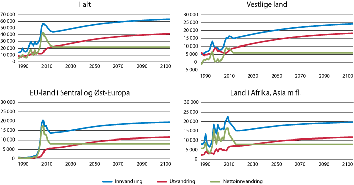 Innvandrere fra vestlige land og EU-land i Sentral- og Øst-Europa har høy utvandring og figuren viser at en årlig innvandring på 5 000 personer fra disse områdene over tid gir en vesentlig lavere befolkning sammenliknet med en årlig befolkningsvekst på 5 000 personer. Mens en årlig vekst på 5 000 personer i befolkningen summerer seg opp til 430 000 personer i 2100, har befolkningen økt med henholdsvis 239 000 og 282 000 personer som følge av innvandring fra vestlige land og EU-land i Sentral- og Øst-Europa på 5 000 personer årlig. Innvandring fra land i Asia, Afrika mfl. på 5 000 personer per år bidrar til at befolkningen årlig øker med mer enn 5 000 personer og i 2100 ligger befolkningen nesten 300 000 personer høyere enn om innvandringen kom fra vestlige land.