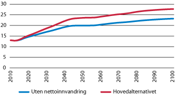 Selv om innvandringsoverskuddets relative betydning for befolkningsveksten forutsettes å avta, vil det likevel være den viktigste grunnen til befolkningsveksten framover. For å illustrere virkningen av innvandring på befolkningens størrelse og sammensetning er det også gjennomført en befolkningsframskriving hvor det er lagt til grunn at inn- og utvandringen er like stor, dvs. at det ikke er noe innvandringsoverskudd fra og med 2010. I dette alternativet vil befolkningen nå sitt høyeste nivå på vel 5,3 mill. personer rundt 2080. Deretter avtar befolkningen svakt og ligger i 2100 hele 3,8 mill personer under hovedalternativet. Selv om befolkningens størrelse framover er særlig avhengig av forutsetninger om innvandringen, vil befolkningens alderssammensetning i mindre grad påvirkes av innvandring. Andelen personer 67 år eller eldre utgjorde ved inngangen til 2010 12,9 pst. av befolkningen. Uten nettoinnvandring vil denne andelen øke jevnt og komme opp i nesten 28 pst. i 2100. Med en nettoinnvandring på 22 000 personer i året vil andelen av befolkningen 67 år og eldre komme opp i vel 23 pst., dvs. om lag 4 prosentpoeng lavere enn i alternativet uten innvandring, jf. figur 12.4.