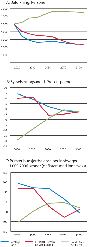 Når innvandringen kommer fra EU-land i Sentral- og Øst-Europa, kommer de negative budsjettvirkningene av aldring noe tidligere enn ved vestlig innvandring. Forskjellen i forhold til innvandring fra land i Asia, Afrika mfl. er imidlertid langt sterkere. For innvandrere fra Asia, Afrika mfl. er bruken av stønader og skattefinansierte offentlige tjenester større enn de skattene som denne innvandringen genererer. Dette avtar imidlertid etter hvert som en økende andel av denne gruppen får lengre botid. På lang sikt vil den økte andelen med etterkommere med samme atferd som majoritetsbefolkningen føre til at gjennomsnittspersonen også i denne gruppen betaler skatter og avgifter og bruker stønader og skattefinansierte offentlige stønader i samme omfang som majoritetsbefolkningen. Beregningene viser klart denne konvergensen fram mot 2100, men beregningshorisonten er for kort til å vise dette for innvandring fra land i Afrika, Asia mfl. Konvergensen går saktere over tid. Det reflekterer en økende andel eldre også i det befolkningstilskuddet som genereres ved innvandring fra land i Asia, Afrika mfl. Aldringen i denne gruppen begynner imidlertid senere enn ved tilsvarende innvandring fra andre land, fordi innvandrerne herfra i gjennomsnitt er yngre enn de som kommer fra vestlige land og sentral- og østeuropeiske EU-land.