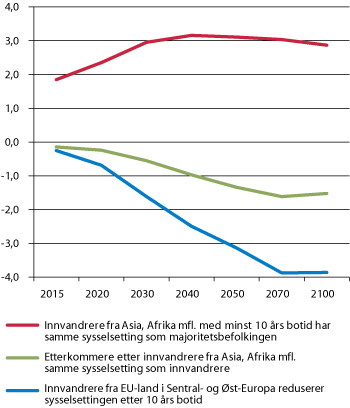 I referansebanen har Statistisk sentralbyrå forutsatt at etterkommere har samme tilknytning til arbeidsmarkedet som majoritetsbefolkningen. Usikkerheten her er stor, og gjennomgangen i kapittel 8 viser at etterkommere i alderen 20–40 år har en svakere tilknytning til arbeidsmarkedet enn majoritetsbefolkningen med tilsvarende alder og kjønn. For å belyse effektene av etterkommeres integrering, har Statistisk sentralbyrå også gjennomført en beregning der etterkommere etter innvandrere fra land i Asia, Afrika mfl. tilpasser seg på arbeidsmarkedet som deres foreldre. I referansebanen utgjør etterkommere etter innvandrere fra land i Asia, Afrika mfl. vel 2 pst. av befolkningen i 2015, stigende til 4½ pst. i 2100. Hvis denne gruppen tilpasser seg som sine foreldre på arbeidsmarkedet, i stedet for å tilpasse seg som majoritetsbefolkningen, vil arbeidstilbudet avta, og i 2030 vil sysselsettingen ligge ½ pst. lavere enn i referansebanen. Denne differansen vil øke og komme opp i 1½ pst. fra 2070. Også virkningen på offentlige finanser vil være betydelig, jf. figur 12.10.