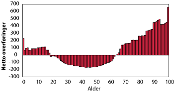 Mens et barn vil være en netto mottaker av overføringer (hovedsakelig i form av utgifter til for eksempel helsetjenester, barnehage, skole osv.), vil en yrkesaktiv voksen normalt være en netto bidragsyter, fordi vedkommendes bidrag i form av betalte skatter og avgifter vil være større enn verdien av de overføringer og tjenester vedkommende mottar fra staten, jf. figur 3.1. Fra pensjonsalder vil forholdet mellom bidrag og overføringer igjen snu, fordi overføringene til eldre (for eksempel gjennom pensjonsutbetalinger og omsorgstjenester) er større enn de skattemessige bidragene. For at velferdsmodellen skal være bærekraftig, kreves det at de samlede nettobidragene er tilstrekkelig store til å dekke de samlede nettooverføringene over tid. Det faktiske finansieringsbehovet vil bl.a. avhenge av befolkningens alderssammensetning.