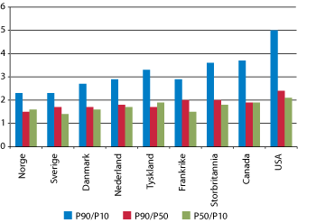 Dale-Olsen og Nilsen viser at lønnsspredningen i Norge, i likhet med mange OECD-land, har økt siden midten av 1990-tallet. Utviklingen i lønnsomhet og stramhet på arbeidsmarkedet har bidratt til denne utviklingen – både økt arbeidsmengde og -innsats og økte bonusutbetalinger har hatt betydning. Norge hadde større endring i lønnsspredningen enn mange andre OECD-land i perioden 1996–2006, likevel var Norge det OECD-landet som hadde minst lønnsspredning i 2006.20 Dette er illustrert i figur 3.2, som viser brutto lønnsfordeling for utvalgte OECD-land i siste tilgjengelige år. Mens P 90 representerer den tidelen av befolkningen som har høyest lønnsinntekt, representerer P10 den tidelen som har lavest lønnsinntekt og P50 representerer medianen i lønnsfordelingen. Det framgår av figuren at lønnssammenpressingen er sterkest i Norge, mens ulikheten er betydelig større i Storbritannia, Canada og USA. Forskjellen mellom landene er spesielt tydelig når en sammenlikner tidelene med de høyeste og laveste lønnsinntektene. Gjennomsnittslønnen i den tidelen av den yrkesaktive befolkningen som har de høyeste lønningene (P 90) er om lag dobbelt så høy som gjennomsnittslønnen i den tidelen av den yrkesaktive befolkningen som har de laveste lønningene. Tilsvarende forholdstall for USA er om lag 5, og for Canada og Storbritannia hhv. 3,7 og 3,6, jf. kolonnen P90/P10.