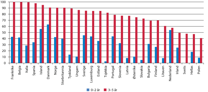 Den sterke investeringen i barnehager kan ses på som et ledd i politikken for å øke arbeidsstyrken, som diskutert ovenfor. Barnehager er viktig i denne sammenhengen av to årsaker. De bidrar til å frigjøre foreldrenes arbeidskraft, slik at begge foreldrene kan være i arbeid samtidig. På lengre sikt er det også en ambisjon at barnehagene skal øke barn og unges læringspotensiale. Dette kan særlig være viktig for barn som kommer fra problembelastede familier, eller familier der foreldrene har spesielle problemer på arbeidsmarkedet. For innvandrerfamilier kan barnehagen være en viktig arena for språkopplæring og integrering, jf. kapittel 9. De nordiske landene har høy barnehagedekning i internasjonal sammenheng (jf. figur 3.3), særlig for de minste barna (under tre år).