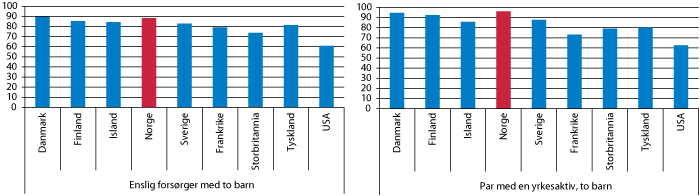 Et annet trekk ved den norske velferdsmodellen, som i økende grad er kommet i forgrunnen, er vekten på likestilling mellom kjønn og en aktiv familiepolitikk. Dette framheves i Arbeidsinnvandringsmeldingen som et mulig fortrinn i konkurransen om arbeidskraft, også kvalifisert arbeidskraft.48 Det skal i utgangspunktet være like lett for kvinner som for menn å finne arbeid i Norge, og godt utbygde og rimelige barnetilsynsordninger gjør det mulig for begge foreldre å delta i arbeidslivet. Begge deler kan gjøre arbeidsmigrasjon lettere og mer attraktivt for velutdannede par.