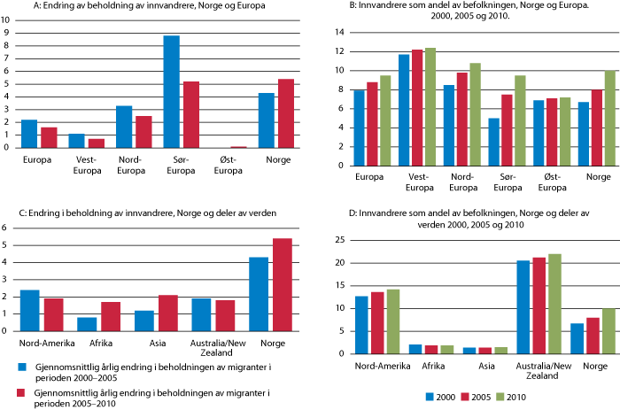 Figur 7.1 Gjennomsnittlig endring i beholdning av innvandere, og innvandrere som andel av befolkningen. Norge sammenliknet med andre regioner. 2000–2010.