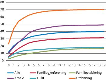 Blant dem med bakgrunn fra land i Afrika, Asia mfl. er flukt og familie de viktigste årsakene til innvandring. Samlet er det 39 pst. som innvandret på grunnlag av innvilget opphold etter asylsøknad eller som overføringsflyktninger (kategorisert som flukt), og videre er det 45 pst. som har innvandret på grunnlag av familietilknytning. Familieinnvandring omfatter også familiegjenforeninger med flyktninger, samlet tilsvarte disse 19 pst. av innvandringene i perioden. Det tydelige spranget i 2002 skyldes at mange saker ble behandlet i UDI dette året. Arbeidsinnvandringen og utdanningsinnvandringen har også økt noe, særlig etter 2005.
