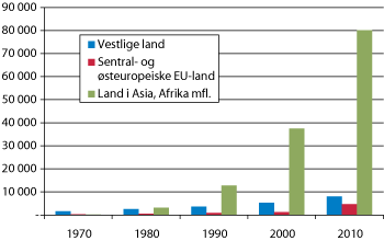 Innvandring fra land i Afrika, Asia, mfl. har gått fra et relativt lavt nivå rundt 1970 og utover 1970-tallet, til å øke sterkt på slutten av 1980-tallet. Høyeste innvandring registrert for disse landene samlet har vært etter år 2000, med en (foreløpig) topp i 2009 med 22 500 innvandringer. Samme år utvandret nær 10 000 personer til et av disse landene, som gir en nettoinnvandring på 12 500 personer. Høyeste nettoinnvandring ble registrert i 1999 med over 16 000 nettoinnvandringer. Landgrupperingen er sammensatt, og skjuler svært ulike innvandringsstrømmer, av arbeidsinnvandrere, familieinnvandrere og ulike flyktningstrømmer, jf. kapittel 4.