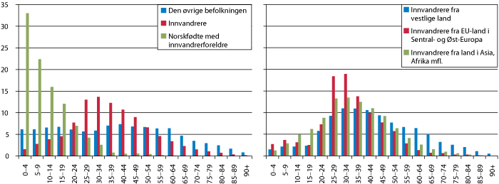 Samlet sett er det en relativt jevn kjønnsfordeling blant innvandrere som bor i Norge, og sammenliknet med befolkningen som helhet, er det relativt mange unge voksne blant innvandrere og etterkommere. Ved inngangen til 2010 var over halvparten av alle innvandrere i alderen 20–49 år, sammenliknet med 39 pst. i den øvrige befolkningen, jf. figur 7.16. Hele 38 pst. av etterkommerne var fem år eller yngre, og 74 pst. var yngre enn 15 år. Tilsvarende andel for innvandrere var 2 og 9 pst. Innvandrere er klart overrepresenterte i de aldersgruppene der sysselsettingen vanligvis er høyest. Etterkommere har derimot ikke kommet i en alder der det er særlig yrkesaktivitet. De fleste som har nådd en slik alder har bakgrunn fra Pakistan, Tyrkia og Vietnam.