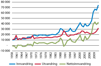 Figur 7.3 Innvandring, utvandring og nettoinnvandring, 1958–2010