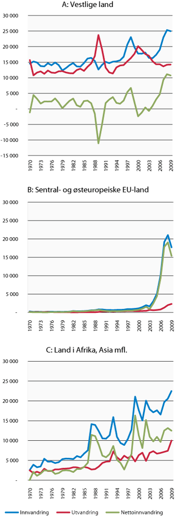 Hovedtrekkene i migrasjonen i perioden 1970–2009 varierer etter fra- og tilflyttingsland. Innvandringen fra vestlige land har i hele perioden vært høy. Innvandringen fra land i Afrika, Asia mfl. begynte først på slutten av 1960-tallet. Først kom arbeidsinnvandrere deretter familieinnvandrere og flyktninger, jf. kapittel 4. Innvandringen fra de sentral- og østeuropeiske landene som nå er EØS-medlemmer, var av lite omfang før 2004.