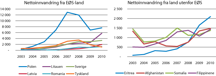 Figur 7.5 viser nettoinnvandring etter statsborgerskap i perioden 2003–2010, etter de ti største innvandrergruppene i 2010. Nettoinnvandringen har vært størst fra Polen, men med en tydelig nedgang fra 2007 til 2009. I 2010 økte nettoinnvandringen fra Polen igjen, og tilsvarende økte nettoinnvandringen også av statsborgere fra Litauen, Latvia og Romania. Fra land utenfor EØS var det høyest nettoinnvandring i 2010 Eritrea.