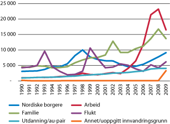 Årsaken til at en innvandrer har innvandret til Norge, kan være av betydning både for arbeidsmarkedstilknytning i Norge og for spørsmålet om en person blir værende i Norge eller gjenutvandrer. Figur 7.6 viser hvilket oppholdsgrunnlag statsborgere fra land utenfor Norden har fått i perioden 1990–2009. I tillegg er innvandring av nordiske statsborgere tatt med, uten identifisert innvandringsgrunn. Innvandring av nordiske statsborgere har gjennom hele perioden vært høyere enn innvandring av andre vestlige statsborgere samlet, jf. figur 7.7. Den registrerte arbeidsinnvandringen har gått noe ned fra 2008 til 2009, noe som til dels kan forklares med at EØS-borgere fra 1. oktober 2009 ikke lenger måtte søke om oppholdstillatelse, jf. boks 7.2.
