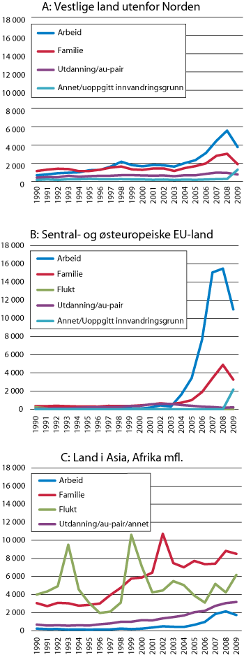 Samlet har én av fire innvandringer blant ikke-nordiske statsborgere i perioden 1990–2009 kommet på grunnlag av arbeid. I 2005 og de påfølgende årene har arbeidsinnvandring utgjort mellom 40 og 50 pst. av alle ikke-nordiske borgere som har innvandret, og aller viktigst for vestlige land og de sentral- og østeuropeiske EU-landene. En analyse viser at arbeidsinnvandrerne som innvandret i perioden 1995–2004 i stor grad bosatte seg i de områdene i Norge hvor det var lavest arbeidsledighet og høyest gjennomsnittslønninger, som Oslo og Rogaland. Analysen er basert på arbeidsinnvandringen før EU-utvidelsen i 2004. Analysen (basert på en rekke økonomiske forutsetninger) tilsier at arbeidsinnvandrere dermed var et positivt bidrag til arbeidsmarkedet.4 Arbeidsinnvandring påvirkes i stor grad av endringer i konjunkturene, og fra 2008 til 2009 var det en klar nedgang i omfanget. Nedgangen mellom 2008 og 2009 er trolig noe påvirket av regelendringene for EØS-borgere.