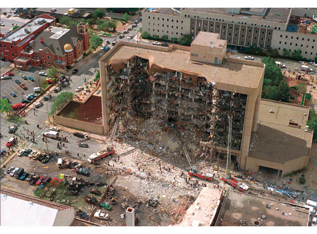 Store terroranslag mot myndighetsmål med mange drepte er først og fremst kjent fra USA. Angrepet mot USAs føderale regjerings administrasjonsbygg i Oklahoma City den 19. april 1995, skiller seg ut som et av de voldsomste og viste med all tydelighet hvor sårbare sentrale bygninger kan være overfor denne type angrep. Angrepet var en direkte inspirasjon for Breivik i planleggingsfasen av 22/7. Gjerningsmannen, Timothy McVeigh, som karakteriseres som en høyreekstremist med sterk våpeninteresse, var motivert av et dypt hat mot USAs regjering. Under forberedelsene til angrepet fikk McVeigh assistanse av Terry Nichols. Angrepet ble utført ved detonasjon av en stor gjødselbombe i en leid kassebil parkert ved inngangspartiet til bygningen. Bomben medførte massive skader. 168 personer ble drept og mer enn 680 skadd. Angrepet førte til en betydelig innskjerping av sikkerheten rundt offentlige bygninger i USA. Siden glassplinter var en framtredende døds- og skadeårsak, ble initiativ for sikring av vindusflater prioritert.64