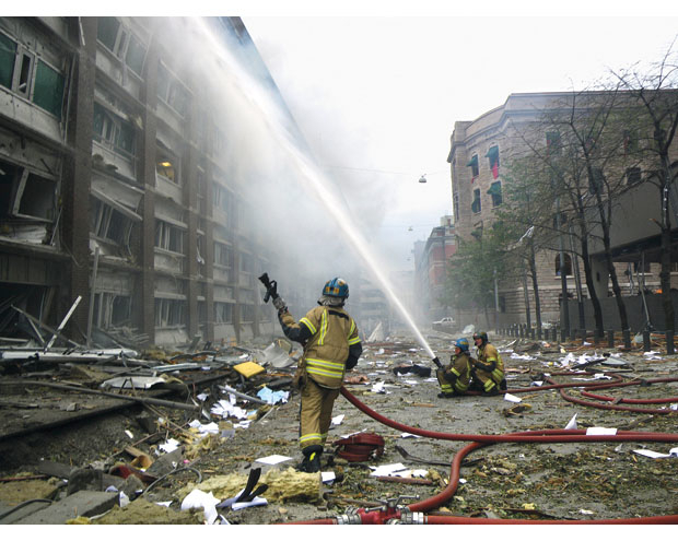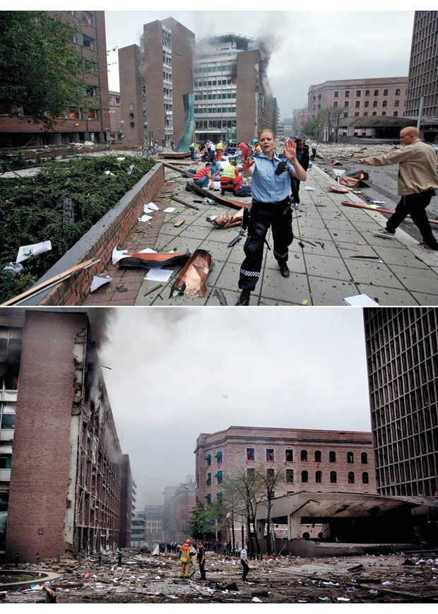 Inne i høyblokka møtte innsatslederen en person som hevdet at det var gått av to bomber, hvilket ikke framsto som usannsynlig i betraktning av det store skadeomfanget.