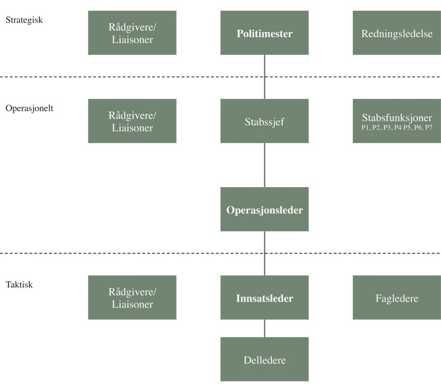 I politidistriktet leder politimesteren polititjenesten på strategisk nivå, og operasjonsleder leder på operativt nivå. På taktisk nivå har innsatslederen den direkte ledelsen av innsatsstyrken, eventuelt med bistand fra en undergitt aksjonsleder.