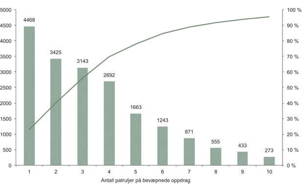 Andelen som skjer i den innerste kjernen av Oslo sentrum, utgjør henholdsvis 37 prosent av alle bevæpninger og 43 prosent av høyprioritetsoppdragene i distriktet, og er totalt sett en vesentlig andel av alle slike hendelser i Norge.