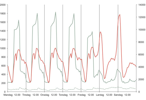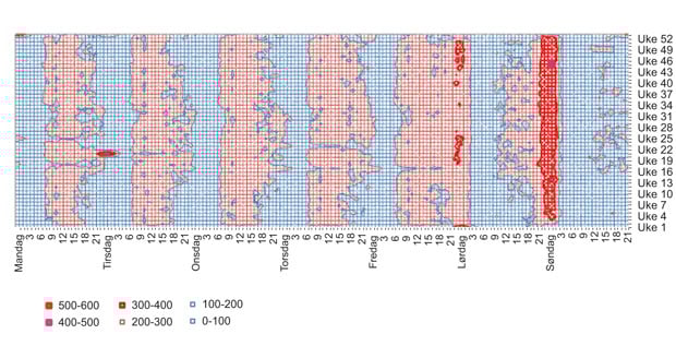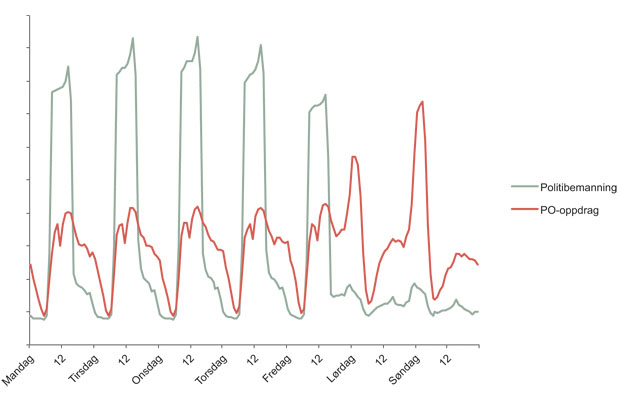 I analysen er TTA-data omgjort til tidsintervaller. Figuren viser i alt nærmere 20 millioner enheter. Antall oppdrag med unik ID utgjør i underkant av 700 000. Mange av disse oppdragene utløser flere beslektede oppdrag, underoppdrag. I denne analysen har vi inkludert disse slik at figuren viser den relative fordelingen av nærmere 900 000 oppdrag registrert av politiets operasjonssentraler.
