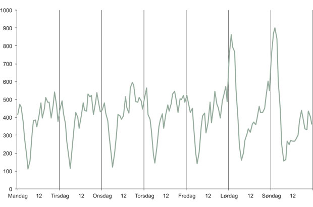 Oslo Datamining prosjektet, 22JK, j.post 636. Oversendt fra OPD-Data i denne studien var også gjort med utgangspunkt i TTA-data. Det er verd å peke på at mye av den pålagte og obligatoriske treningen skjer ved ukens start.