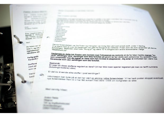 Utrustningen Breivik har importert, består av legale varer.14 En rekke av innkjøpene var av en slik størrelsesorden at de var tollpliktige. Varene som ble tolldeklarert, ble deklarert i eget navn, og betalt merverdiavgift for. En rekke innkjøp ble dermed registrert i Toll- og avgiftsdirektoratets registre. Varene under deklarasjonsgrensen ble stort sett sendt som pakkepost. Disse har i all hovedsak blitt sendt til Breiviks lokale postbutikk og hentet av ham personlig.