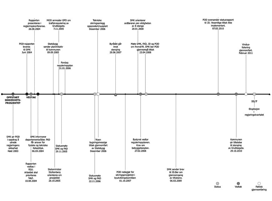Rapport. «Sikkerhetsanalyse av fysiske og tekniske sikringstiltak i departementene», 10. mars 2004, s. 87 og Prosjektrapport, Regjeringens sikkerhet, s. 44.