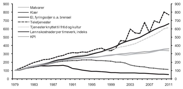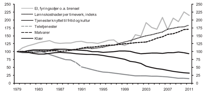 Figur 4.1 illustrerer hvordan den nominelle prisutviklingen på ulike varetyper har vært mellom 1979 og 2011. Utviklingen i konsumprisindeksen er også tegnet inn. Figur 4.2 illustrerer realprisutviklingen (nominell prisvekst fratrukket veksten i konsumprisindeksen) for varetypene, og i tabell 4.1 er den årlige prosentvise veksten i disse og enkelte andre realpriser gjengitt. Vi ser at veksten i reallønnen (reallønnskostnaden per time for arbeidsgiverne, men også kjøpekraften for arbeiderne) har vært 1,9 prosent i den aktuelle perioden. Realprisen på klær har falt med 3,6 prosent, noe som i stor utstrekning kan forklares av ”Kina-effekten” på internasjonale priser og har svært lite med den norske lønnskostnadsveksten å gjøre (se for eksempel kapittel 7 i Økonomiske analyser, 1/2011, (Statistisk sentralbyrå, 2011). Realprisen på tjenester knyttet til fritid og kultur har derimot økt med 1,7 prosent, noe som i stor utstrekning kan forklares med den innenlandske lønnkostnadsveksten. Den negative realprisutviklingen på teletjenester (på 5,8 prosent) skyldes hovedsakelig ny teknologi og økt konkurranse som følge av dereguleringer. Videre ser vi at prisen på matvarer har falt reelt med 0,2 prosent gjennomsnittlig i perioden, mens prisen på elektrisitet og fyringsolje har steget med gjennomsnittlig 2,4 prosent årlig. I tabellen ser vi også at konsumprisindeksen har vokst med om lag 4,1 prosent årlig i samme periode. Selv om historiske tall ikke nødvendigvis sier noe om framtiden, er det grunn til å tro at priser også vil utvikle seg ulikt framover i tid.
