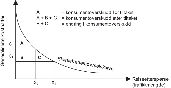 Kostnaden ved å gjennomføre reisen måles langs den vertikale aksen. Nytten for den enkelte ved å gjennomføre reisen framgår av etterspørselskurven, som viser den private marginale betalingsvilligheten. Den enkelte vil gjennomføre en reise dersom nytten overstiger kostnaden hun står overfor. Til reisekostnaden G0 vil det gjennomføres X0 reiser. Prosjektet vi analyserer reduserer kostnaden ved å gjennomføre reisen fra G0 til G1. De som allerede gjennomførte reisen før prosjektet ble gjennomført, vil få en reduksjon i sin reisekostnad som er nøyaktig lik G0- G1. Dette vil gi dem økt brukeroverskudd. Videre vil det være noen som før prosjektet ikke reiste, men som nå vil gjennomføre reisen siden kostnaden har gått ned. Antall nye reiser er endringen fra X0 til X1. Disse vil få et samlet økt konsumentoverskudd som er gitt av arealet mellom betalingsvillighetskurven og den nye reisekostnaden. For den første nye reisende vil nytten være rett i underkant av (G0-G1), mens den for den siste nye reisende vil nytten så vidt være høyere enn null. Punktet (G1, X1), er den nye likevekten etter at prosjektet er gjennomført.