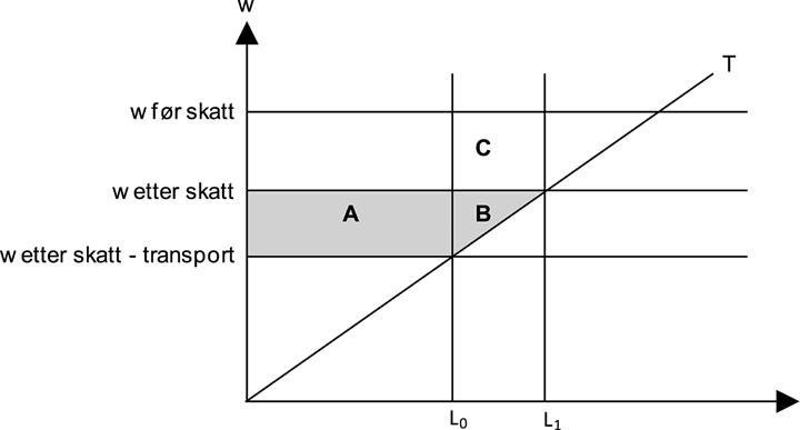 Hva er den samfunnsøkonomiske virkningen av transporttiltaket? De som allerede deltok i arbeidslivet vil få høyere disponibel inntekt etter at transportkostnadene har falt bort. Dette er representert ved areal A i figur 7.2. Videre vil det økte arbeidstilbudet, enten i form av at de som deltok i arbeidslivet øker antall tilbudte timer eller det kommer nye deltakere, få økt nytte ved at det de tjener på å arbeide overstiger deres verdi av fritid. Dette er representert ved areal B i figur 7.2. Disse virkningene vil fanges opp i en ordinær nytte-kostnadsanalyse. Verdien av produksjonen til det økte arbeidstilbudet tilsvarer imidlertid lønn før skatt. Differansen mellom den samfunnsøkonomiske verdien ved økt sysselsetting, og den verdien som den enkelte tar hensyn til i sin tilpasning, er representert med areal C i figur 7.2. Denne tilsvarer verdien av den økte skatteinngangen som følge av økt sysselsetting, og representerer en netto ringvirkning av økt sysselsetting i en økonomi med skatt på arbeidsinntekt.
