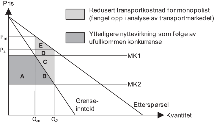 La oss se på et firma som opererer i et marked karakterisert ved ufullkommen konkurranse, og som derfor kan ta en pris som er høyere enn marginalkostnaden. Anta videre at dette firmaet står overfor en transportkostnad som varierer proporsjonalt med produksjonsnivået i bedriften som gir en konstant marginalkostnad. I figur 7.3 er dette illustrert ved en monopolist, og den optimale tilpasningen til monopolisten er i punktet Pm, Qm. Dersom et transportprosjekt gir lavere transportkostnader for firmaet, vil dette, alt annet likt, gi lavere marginalkostnader for firmaet, illustrert ved et skift i marginalkostnadskurven fra MK1 til MK2. Firmaet responderer på de lavere produksjonskostnadene ved å redusere prisen og øke produksjonen til P2, Q2. Arealet A+B tilsvarer den nytten som fanges opp som verdien av reduserte generaliserte reisekostnader for næringslivet i ordinære nytte-kostnadsanalyser. I figur 4.3 ser vi at siden firmaet kan fastsette en pris som er høyere enn marginalkostnaden, så er betalingsvilligheten til konsumentene av en ekstra enhet (som framgår av etterspørselskurven) høyere enn kostnaden ved å produsere den (marginalkostnadskurven). Ved økt produksjon gir dette en effektivitetsgevinst som kommer i tillegg til den som er fanget opp gjennom ordinær nytte-kostnadsanalyse. Denne ekstra effektivitetsgevinsten er illustrert ved arealet C+D+E i figure 7.3. Denne effektivitetsgevinsten er netto ringvirkninger av økt produksjon i markeder med ufullkommen konkurranse.