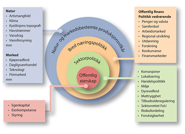 Den brede næringspolitikken omfatter forhold som ligger utenfor sektorpolitikken for sjømatnæringen (se Figur 5.1), og vil bare i begrenset grad omtales. Sektorpolitikken inneholder imidlertid en rekke elementer utvalget mener kan endres. Disse vil derfor diskuteres mer inngående.