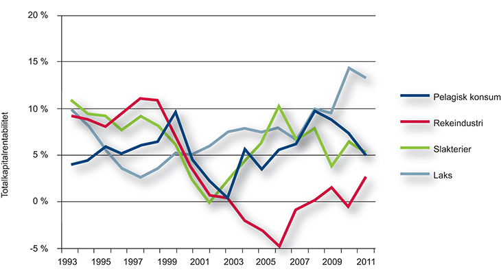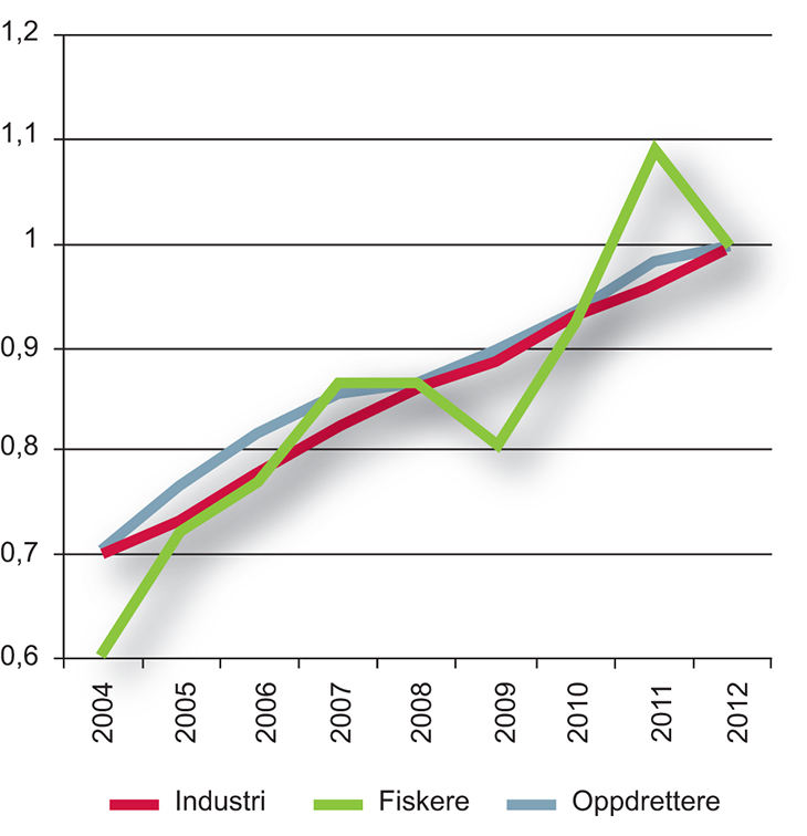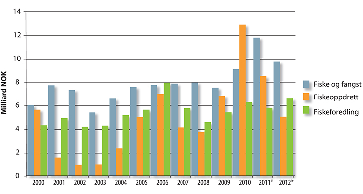 I løpet av 50-årsperioden 1972–2011 økte produktiviteten (målt i bruttoprodukt per time) i fiske, fangst og akvakultur med 1 710 pst., samtidig som produktiviteten i utvinning av råolje og naturgass falt med 50 pst. (Meld. St. 39 (2012–2013)).
