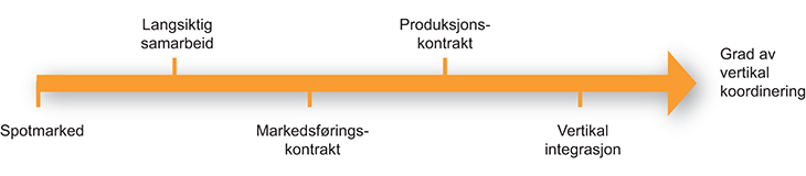 Vertikal integrasjon, som beskrevet i foregående delkapittel, representerer som nevnt et av ytterpunktene i organiseringen av verdikjeden. Vare- og informasjonsstrømmen kan også organiseres gjennom andre modeller, eksempelvis auksjonsbaserte systemer, langsiktige kontrakter eller individuelle forhandlinger. I hvilken grad salgslagene legger til rette for slike alternative organisasjonsformer kan ha betydning for lønnsomhet og verdiskaping.