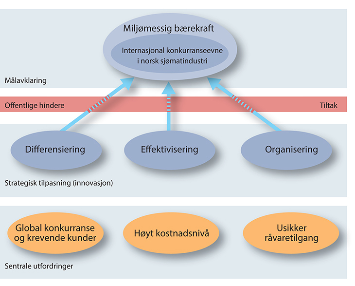 I dette bildet er det viktig å peke på hvilke utfordringer sjømatindustrien møter, hvilket handlingsrom næringen og myndighetene besitter for å tilrettelegge for lønnsomhet og verdiskaping. På et overordnet nivå kan de viktigste muligheter, utfordringer og det strategiske handlingsrom for norsk sjømatindustri sammenfattes i figur 10.2 under. Som et viktig premiss for dette ligger forutsetningen om at næringsaktiviteten er miljømessig bærekraftig.
