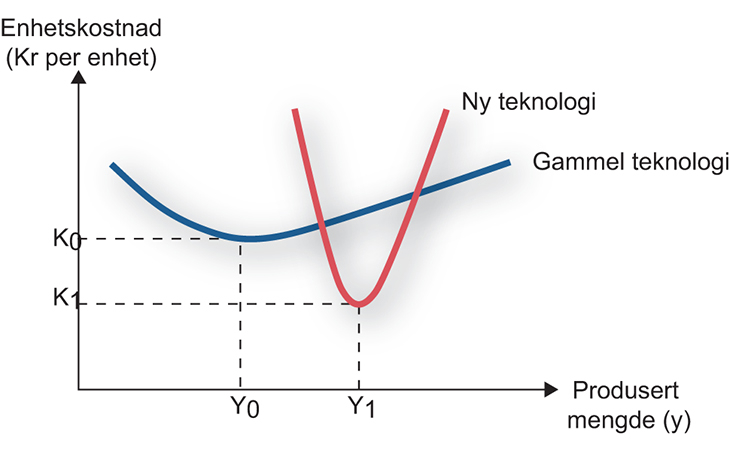 Figur 11.2 viser et eksempel der en teknologisk endring øker den optimale produksjonsskalaen til en bedrift, noe som har vært tilfelle for mange teknologiske endringer i næringsmiddelindustrien og sjømatindustrien. Produksjonsvolumet Y0 gav minimale kostnader K0 per produsert enhet for den gamle teknologien, mens for den nye teknologien er det kostnadsminimerende produksjonsvolumet Y1, som gir lavere enhetskostnader K1. Men for at den økonomiske gevinsten ved den nye produksjonsteknologien skal realiseres må virksomheten først investere i den nye teknologien og deretter få tilgang til variable innsatsfaktorer som gjør det mulig å produsere optimalt til den nye teknologien.