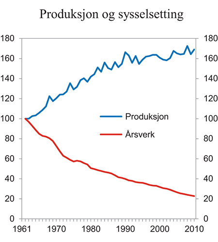 I 2012 var det 44 800 jordbruksbedrifter i Norge (Budsjettnemnda for jordbruket, 2014). Det samlede arbeidsforbruket er anslått til 49 200 årsverk, tilsvarende knapt 2 pst. av den samlede sysselsettingen i landet. I perioden 2000 – 2012 ble antall jordbruksbedrifter redusert med i gjennomsnitt 3,5 pst. per år, mens antall årsverk ble redusert med knapt 4 pst. per år. I løpet av de siste 50 årene har antall årsverk i jordbruket blitt redusert med nesten 80 pst., mens produksjonen har økt med nesten 70 pst., jf. figur 13.1. Produksjonen per foretak var i 2010 om lag 8 ganger høyere enn i 1961. Antall årsverk per foretak er likevel lavere i dag enn for 50 år siden. Produksjonsveksten har de senere årene avtatt. Flere dårlige avlingsår i kornproduksjonen er blant årsakene til dette.